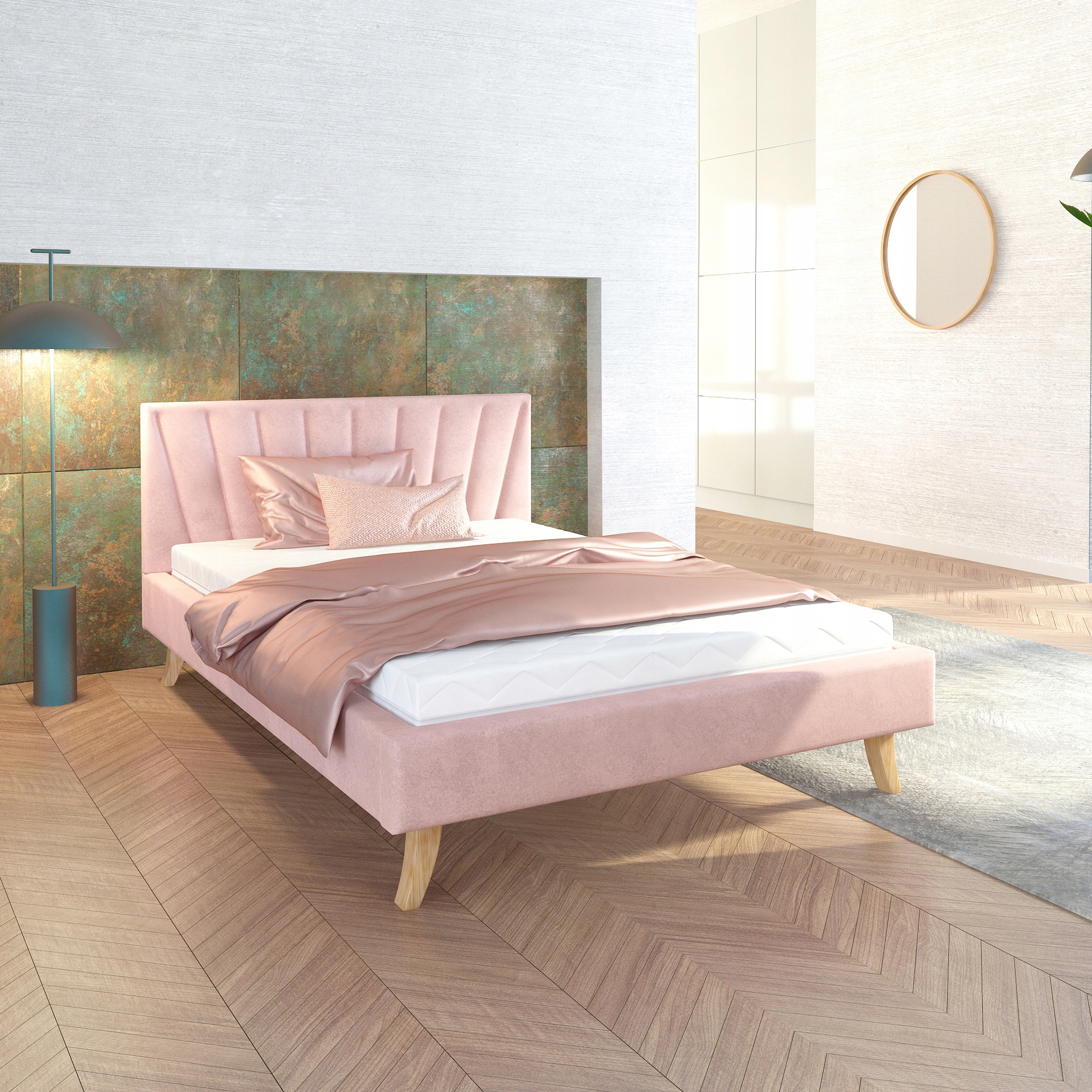 Tapicerowana Rama łóżka MALMOStelaż -maksymalne obciążenie stelaża wynosi 200 kg.Dwustronny materac piankowy BERGAMOZestaw śrub do montażu.Nóżki drewniane 18 cm.