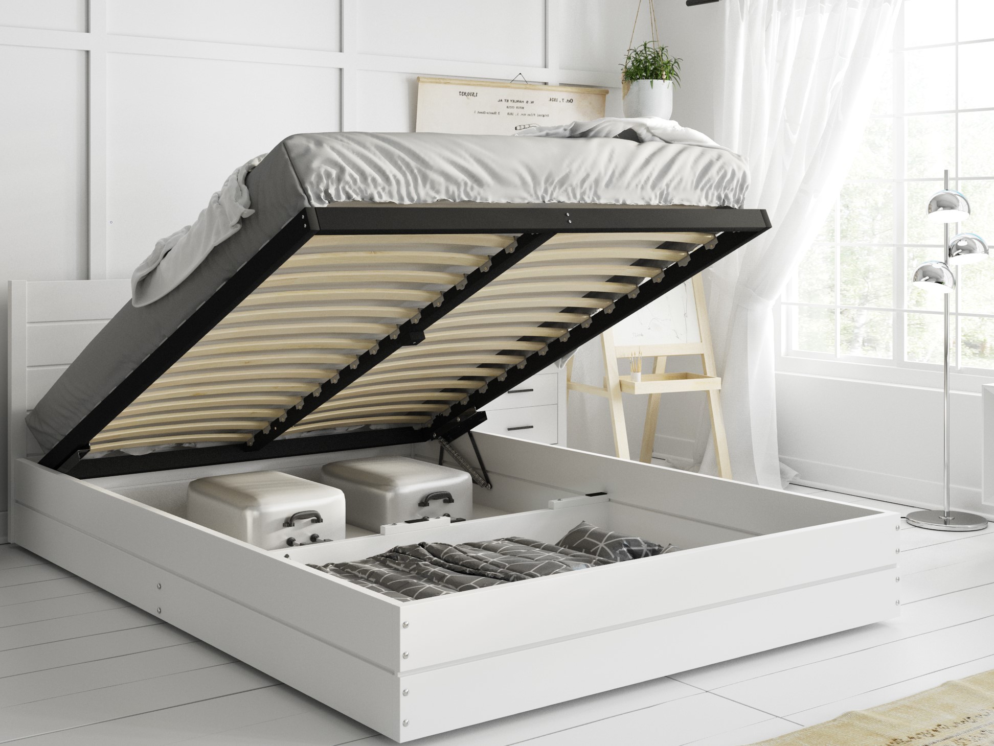 5. Po podniesieniu stelaża przestrzeń podzielona przegrodą. W tylnej części brak spodu dna. W przedniej pojemnik na pościel.