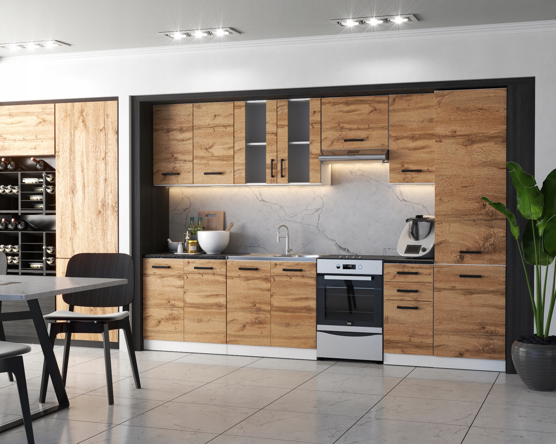 - Modularność: Zestaw meblowy jest elastyczny i modułowy, co umożliwia dostosowanie go do indywidualnych potrzeb i wymiarów kuchni, zapewniając optymalne wykorzystanie dostępnej przestrzeni.