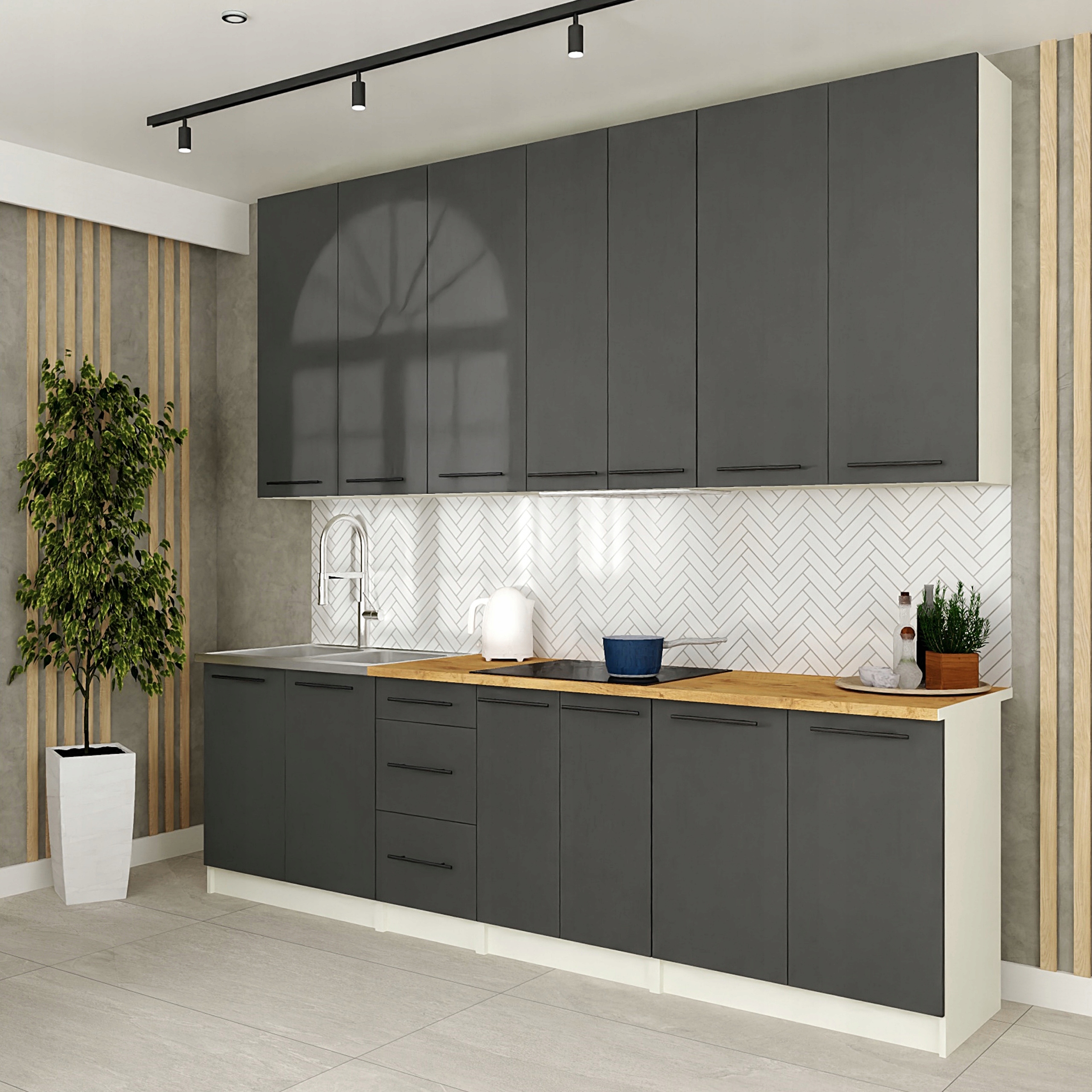 Meble kuchenne z BLATEM – 2,6 m – FLIP szary – wysokie góry na 100 cm